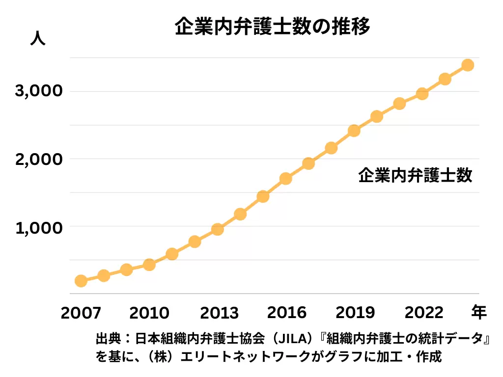 2023年6月時点では、企業で働く弁護士は約3,000人に上り、年々その数は増加傾向にあります。