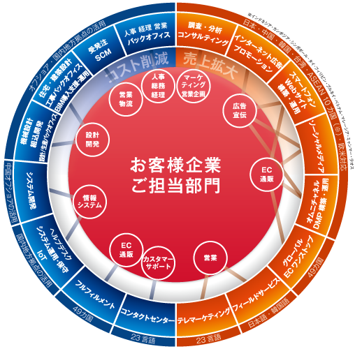 個々のサービスでは、創業時からビジネスノウハウを蓄積しているBPOの更なるグローバル化は勿論のこと、Digital Marketing、EC、Contact Centerの頭文字を取った「DEC(デック)」として組織を統合して高度なサービスを提供し、ワンストップでのグローバル展開を加速していきます。