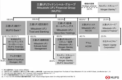 株式会社三菱UFJフィナンシャル・グループは、商業銀行・信託銀行・証券会社をはじめ、カード会社、消費者金融会社、リース会社、資産運用会社等、主要金融分野でトップクラスの企業が一体となり、様々な金融サービスを提供している。