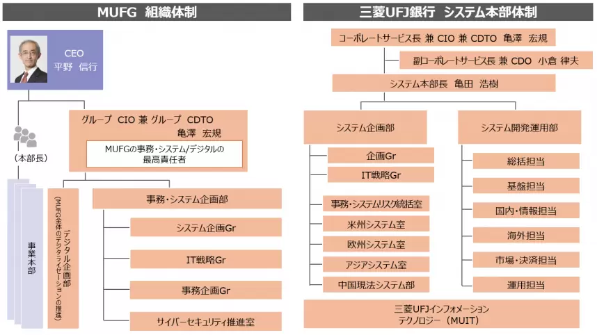 MUFGの組織体制(左)、及び(株)三菱UFJ銀行のシステム本部体制(右)