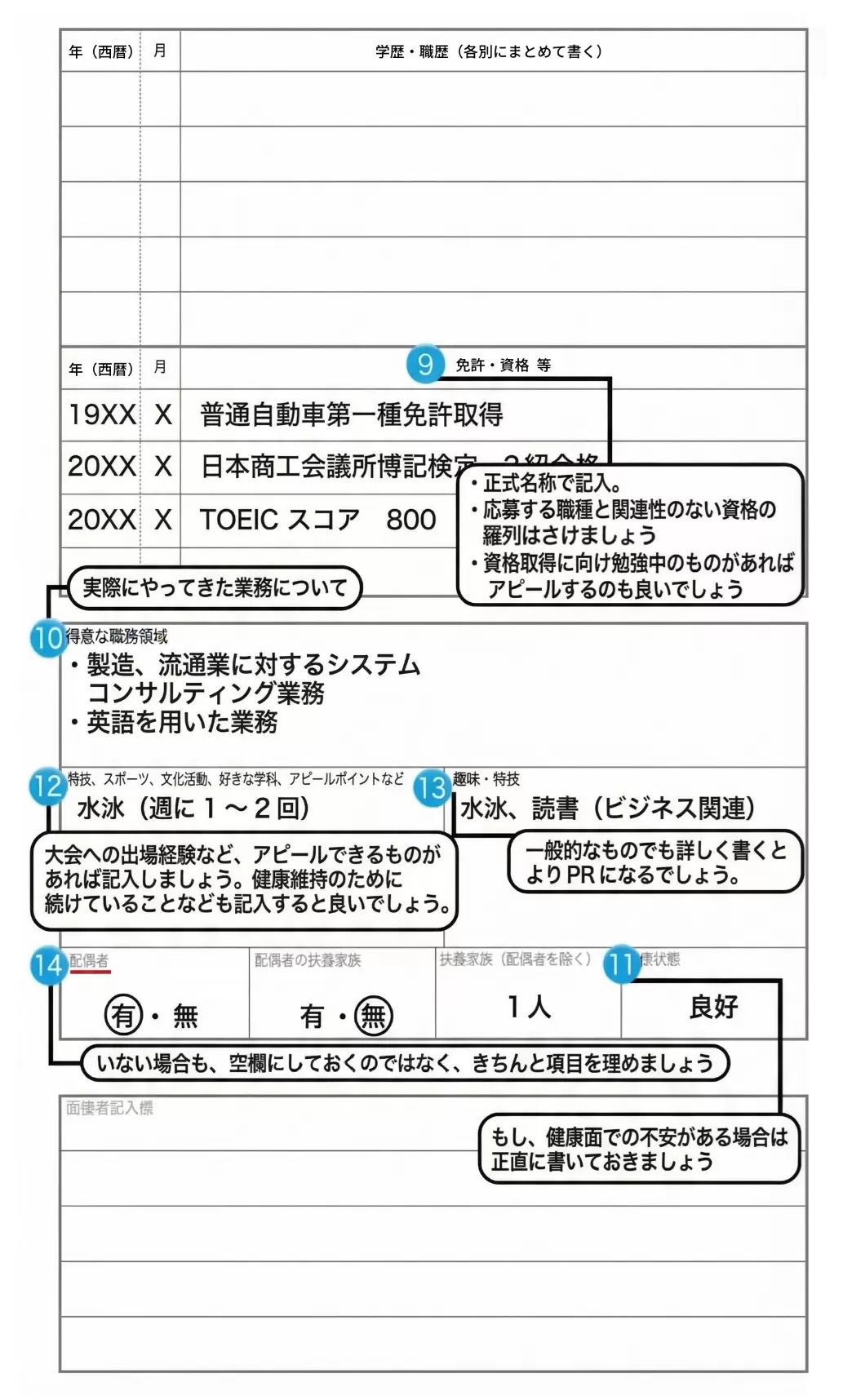 ◆ 特段問題がない場合は「良好」、健康上の心配事項がある方は、この欄に正直に書いておきましょう。入社後に、当初の話と違うということになっては、元も子もありません。